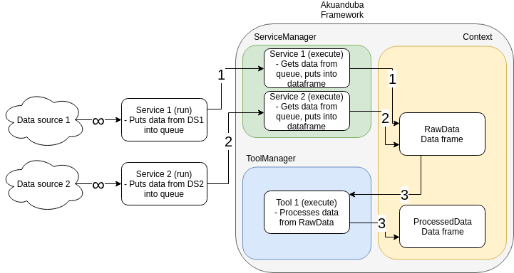As you may see, the run method of the services acquire data in real time (∞) and append it to its own queue. On the main Akuanduba loop, the execute methods are called and the data is stored on the data frames (1 and 2). After that, the tools execute method will be called, where the data will be processed and stored on another data frame (3).