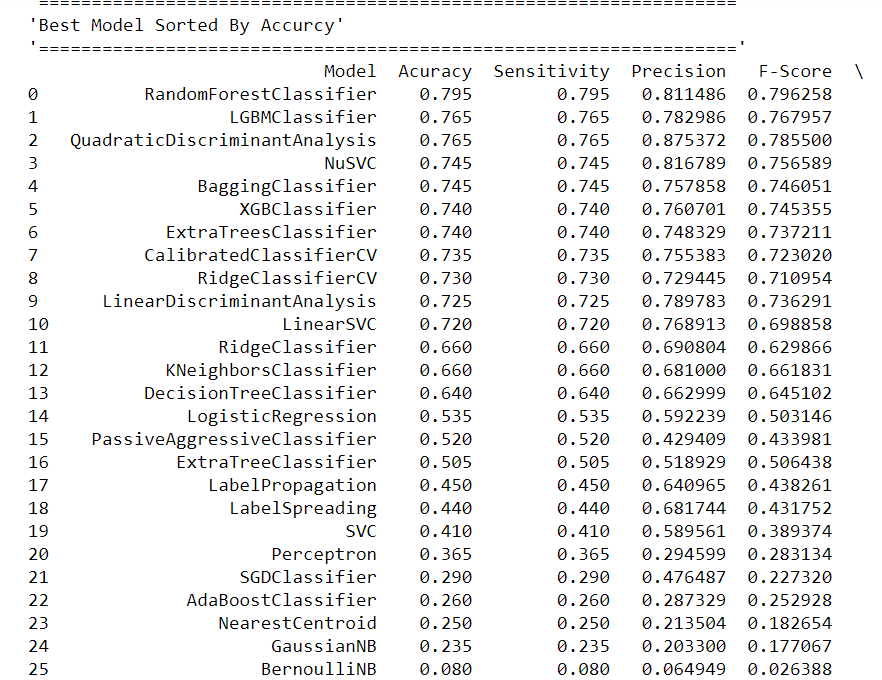 model = Auto_Audio_Classification(test_size=0.2,label_encoding=True,result_dataframe=False,aug_data=True)