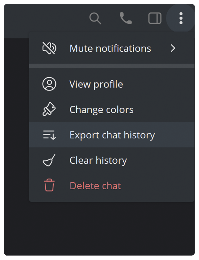 Find the three dots menu, and select the Export chat history option: