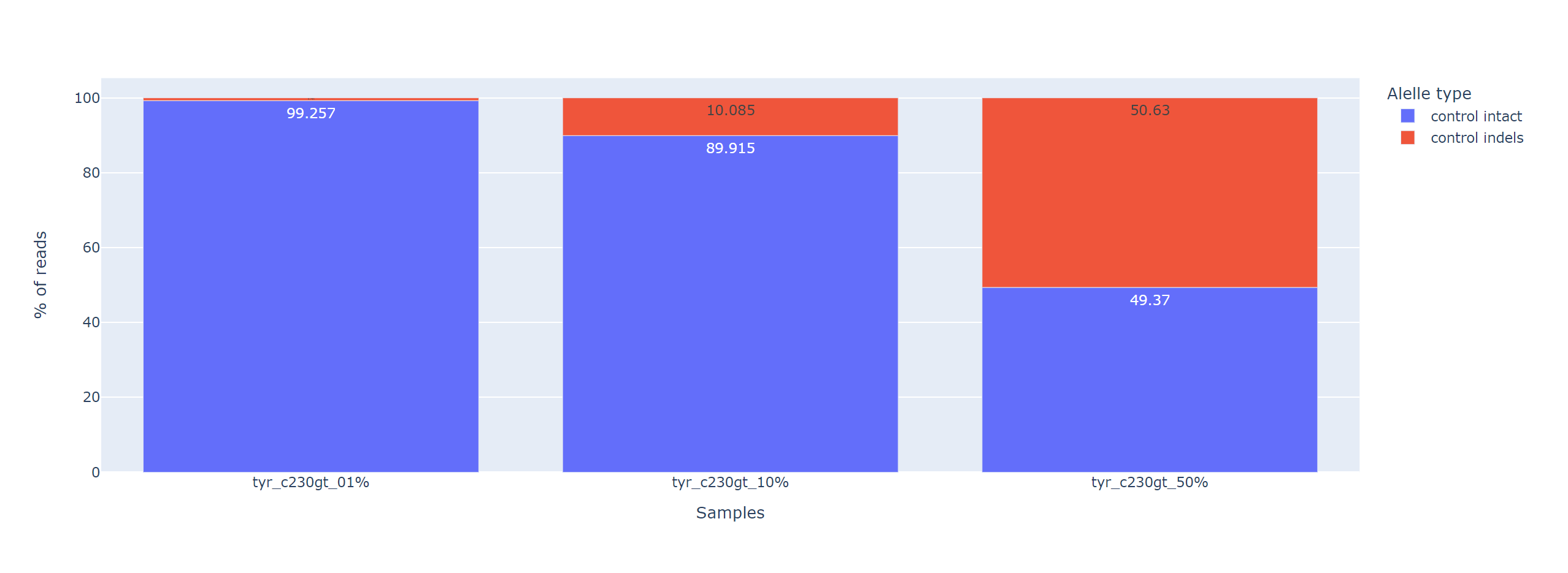 The chart's Allele type indicates the type of allele, and % of reads shows the proportion of reads for that allele.