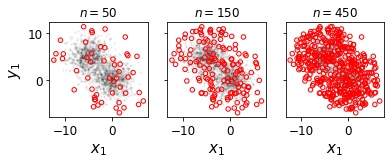 The selected DS subsample is fully-sequential. We can plot the subsamples at various sizes as follows. In the below plot, n denotes the subsample size. The red open circles indicate selected subsample points and the gray dots represent a size-2000 random subset of the data.
