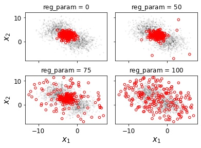 The following figure shows the selected custom subsamples with varying reg_param values at subsample size n = 200. The red open circles indicate selected subsample points; the small gray dots represent a random subset with size 2000 of the data.