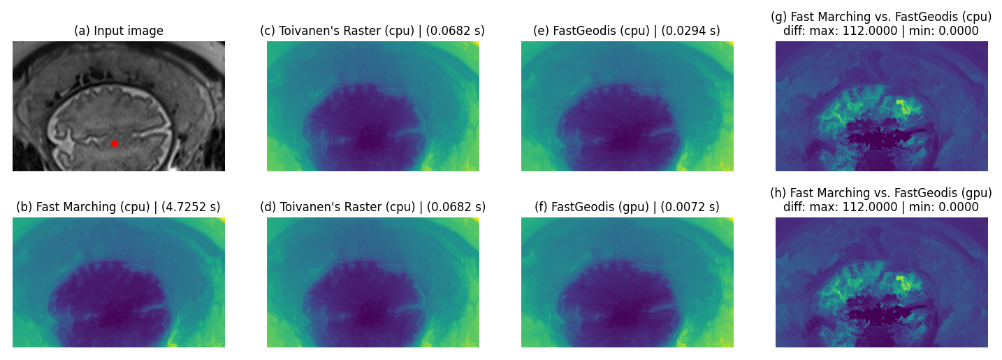 | Fast Marching Geodesic Distance 3D | Fast Marching geodesic distance transform for CPU [9] | FastGeodis.geodesic3d_fastmarch |