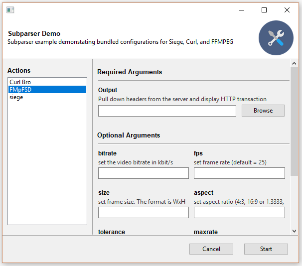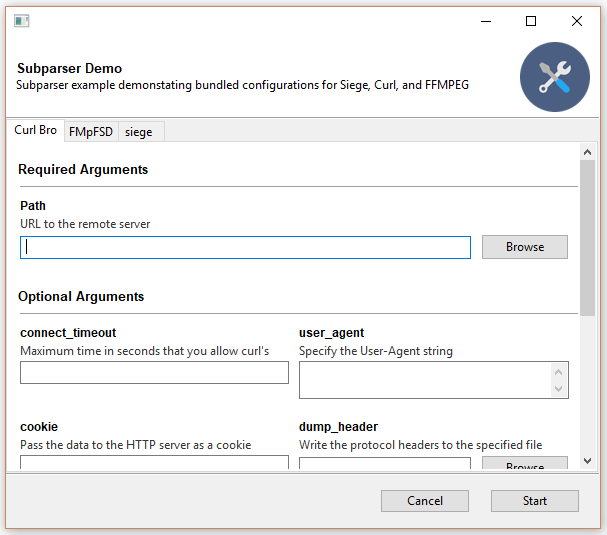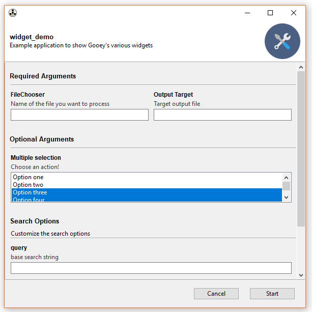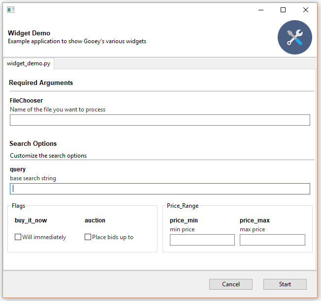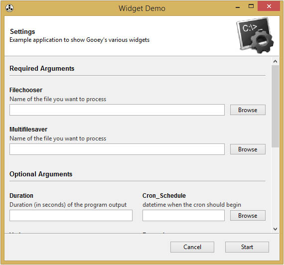 If the above defaults aren't cutting it, you can control the exact widget type by using the drop-in ArgumentParser replacement GooeyParser. This gives you the additional keyword argument widget, to which you can supply the name of the component you want to display. Best part? You don't have to change any of your argparse code to use it. Drop it in, and you're good to go.