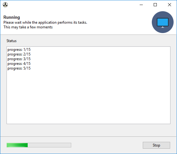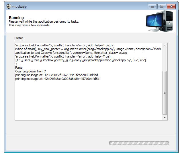 Giving visual progress feedback with Gooey is easy! If you're already displaying textual progress updates, you can tell Gooey to hook into that existing output in order to power its Progress Bar.