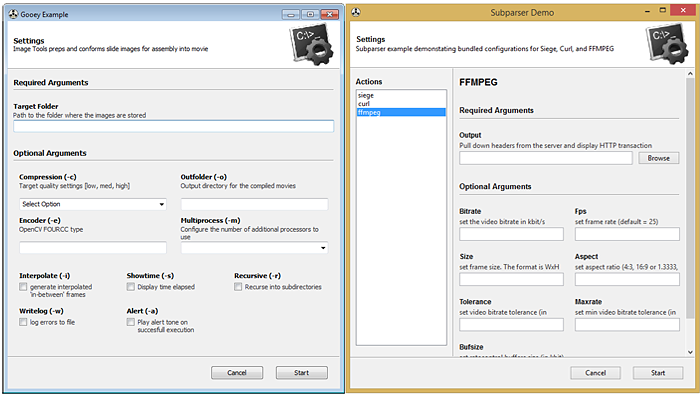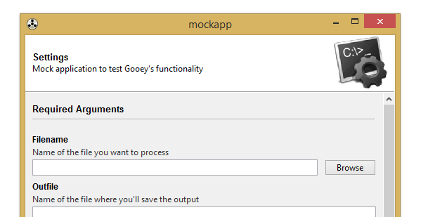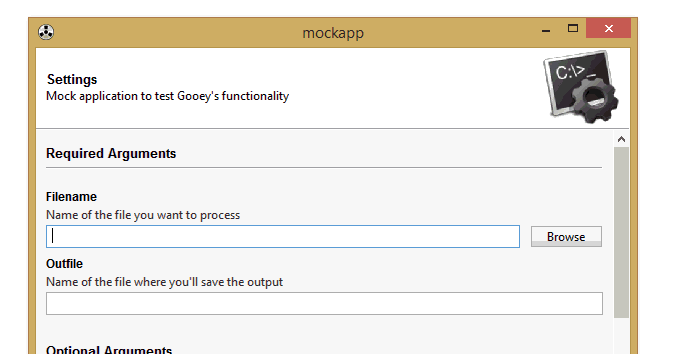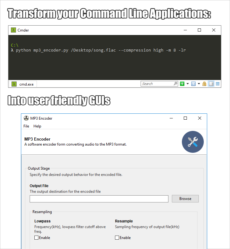 Gooey converts your Console Applications into end-user-friendly GUI applications. It lets you focus on building robust, configurable programs in a familiar way, all without having to worry about how it will be presented to and interacted with by your average user.