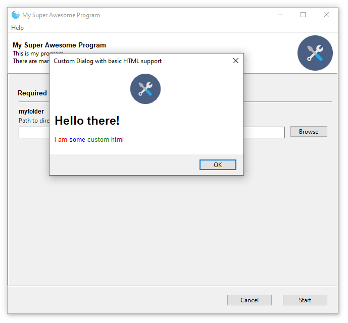 Gooey comes with a set of six default icons. These can be overridden with your own custom images/icons by telling Gooey to search additional directories when initializing. This is done via the image_dir argument to the Gooey decorator.