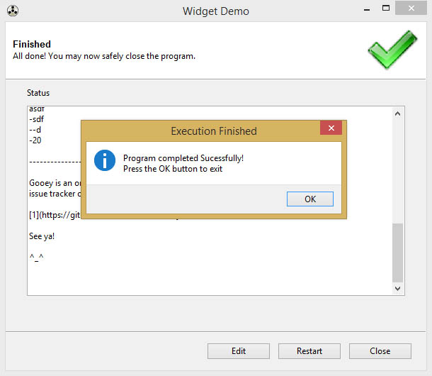 As of 1.2.0, Gooey now exposes coarse grain lifecycle hooks to your program. This means you can now take additional follow-up actions in response to successful runs or failures and even control the current state of the UI itself!
