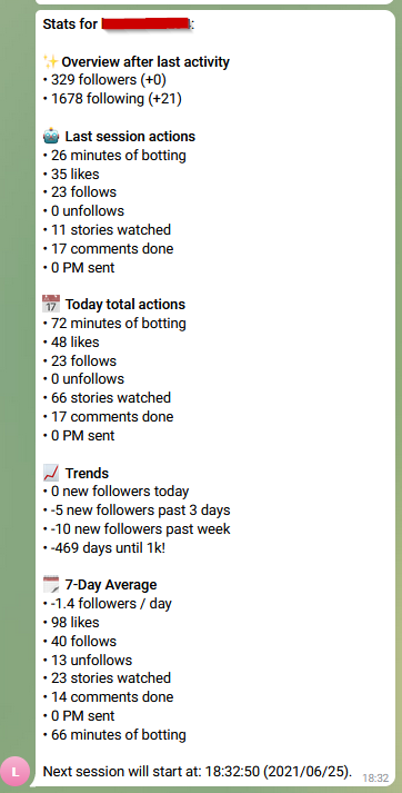 In this case trends are negative because I use this account only for tuning this bot, and it's private... I didn't accept anyone lately so the trends are meh :P