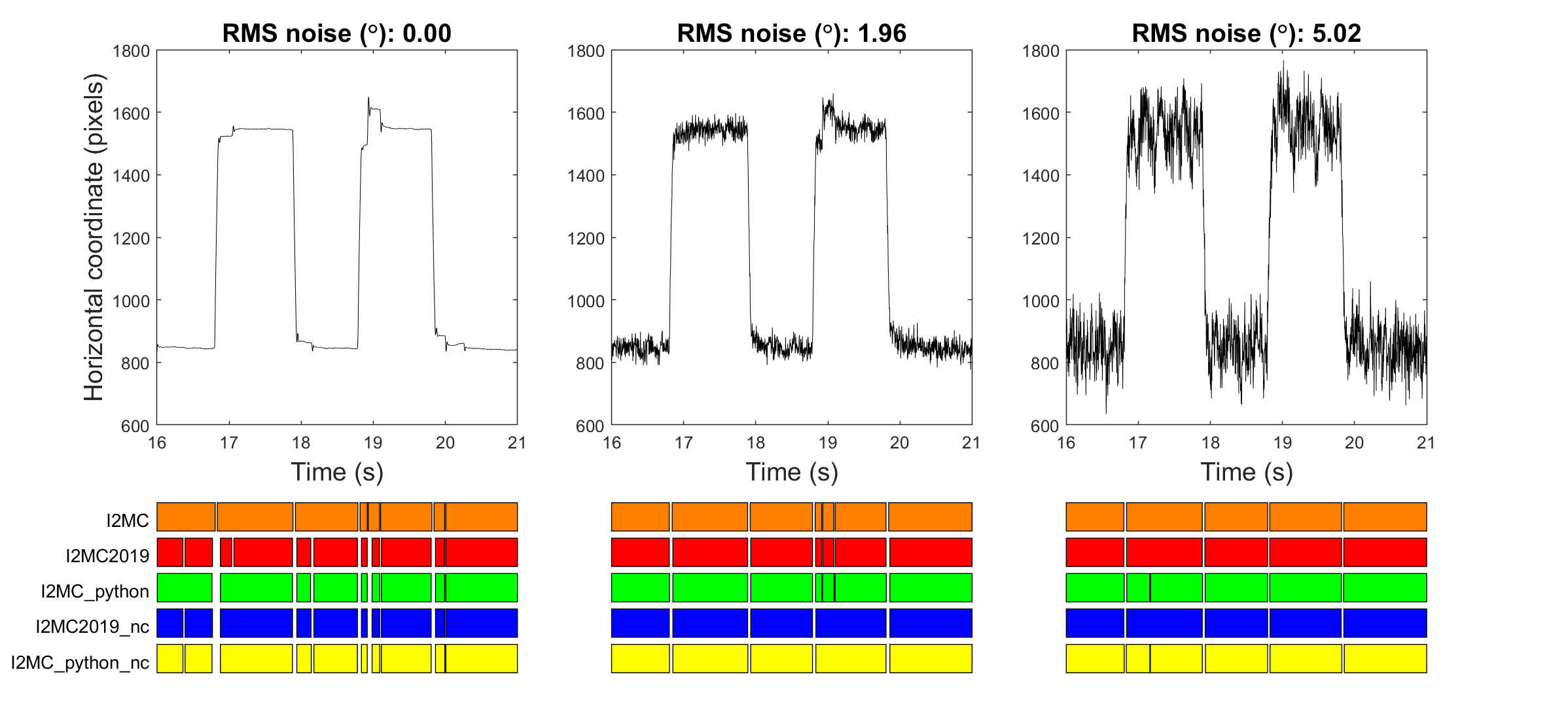 Figure 2. Classified fixations for episodes of example eye-tracking data using the MATLAB and Python I2MC implementations. I2MC is the original published version of I2MC. I2MC2019 is a slightly modified version (the latest version from the original I2MC repository as of this writing [v2.0.3]). _python stands from the Python implementation in this repository. _nc stands for No Chebychev filtering. For more information on this specific analysis see Figure 8 in the original I2MC paper and the corresponding text.