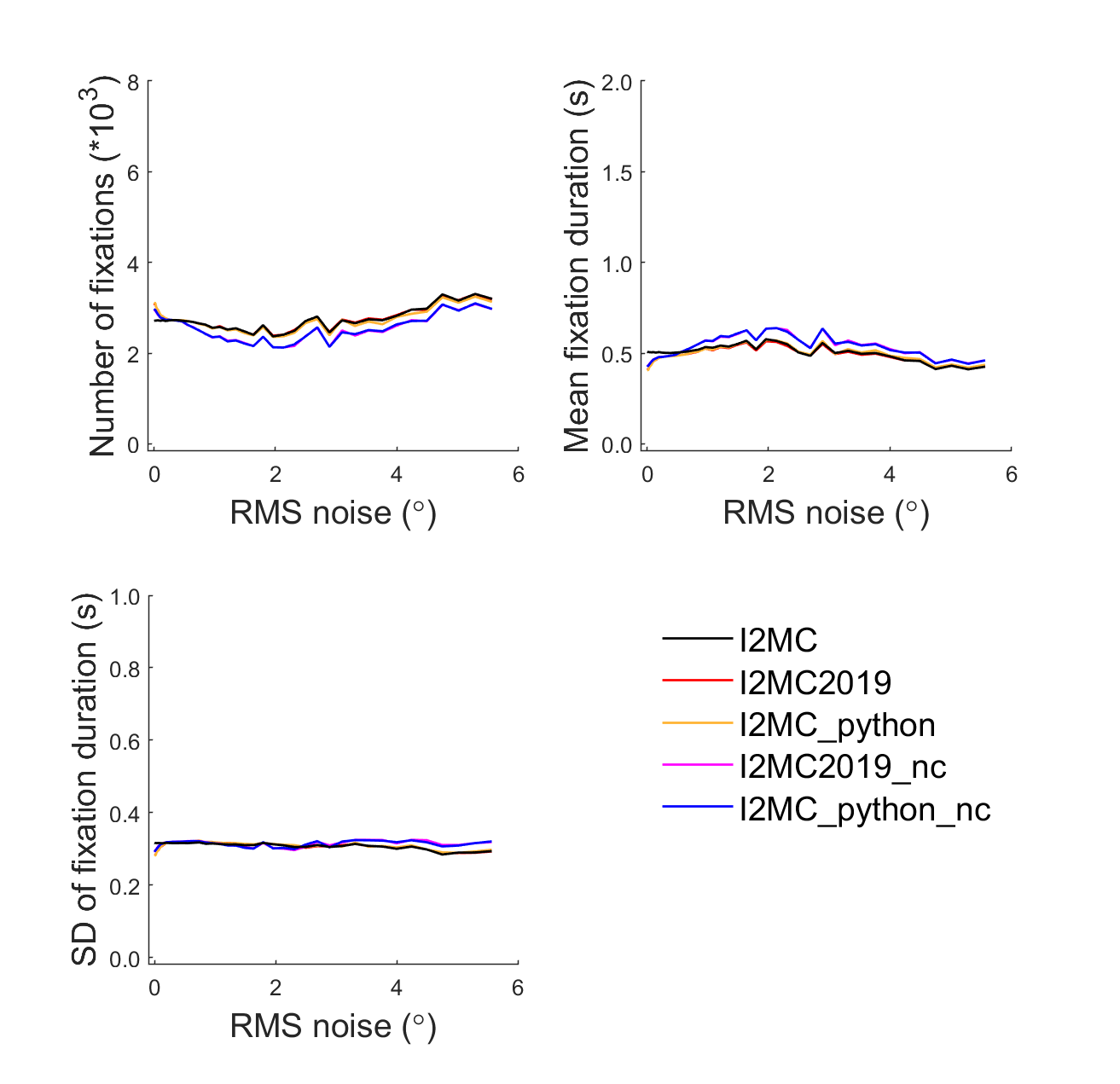 Figure 1. Number of fixations, mean fixation duration and SD of fixation duration for the MATLAB and Python I2MC implementations using the RMS noise data set from the original I2MC paper. I2MC is the original published version of I2MC. I2MC2019 is a slightly modified version (the latest version from the original I2MC repository as of this writing [v2.0.3]). _python stands for the Python implementation in this repository. _nc stands for No Chebychev filtering. For more information on this specific analysis see Figure 3 in the original I2MC paper and the corresponding text.