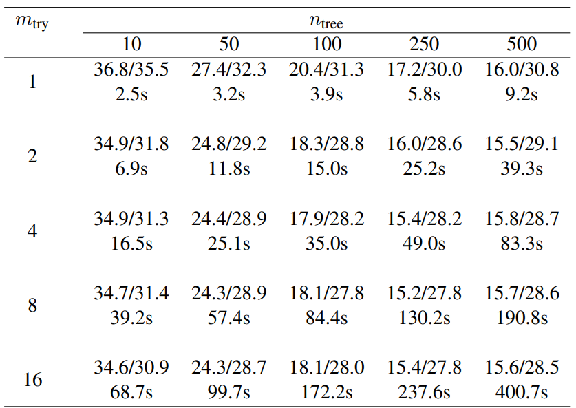 Table 2: Average imputation error (NRMSE/PFC in percent) and runtime (in seconds) with different numbers of trees (ntree) grown in each forest and variables tried (mtry) at each node of the trees. Here, we consider the GFOP data set with artificially introduced 10% of missing values. For each comparison 50 simulation runs were performed using always the same missing value matrix for all numbers of trees/randomly selected variables for a single simulation.