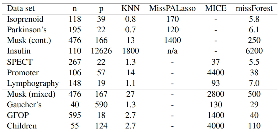 Table 1: Average runtimes [s] for imputing the analyzed data sets. Runtimes are averaged over the amount of missing values since this has a negligible effect on computing time.