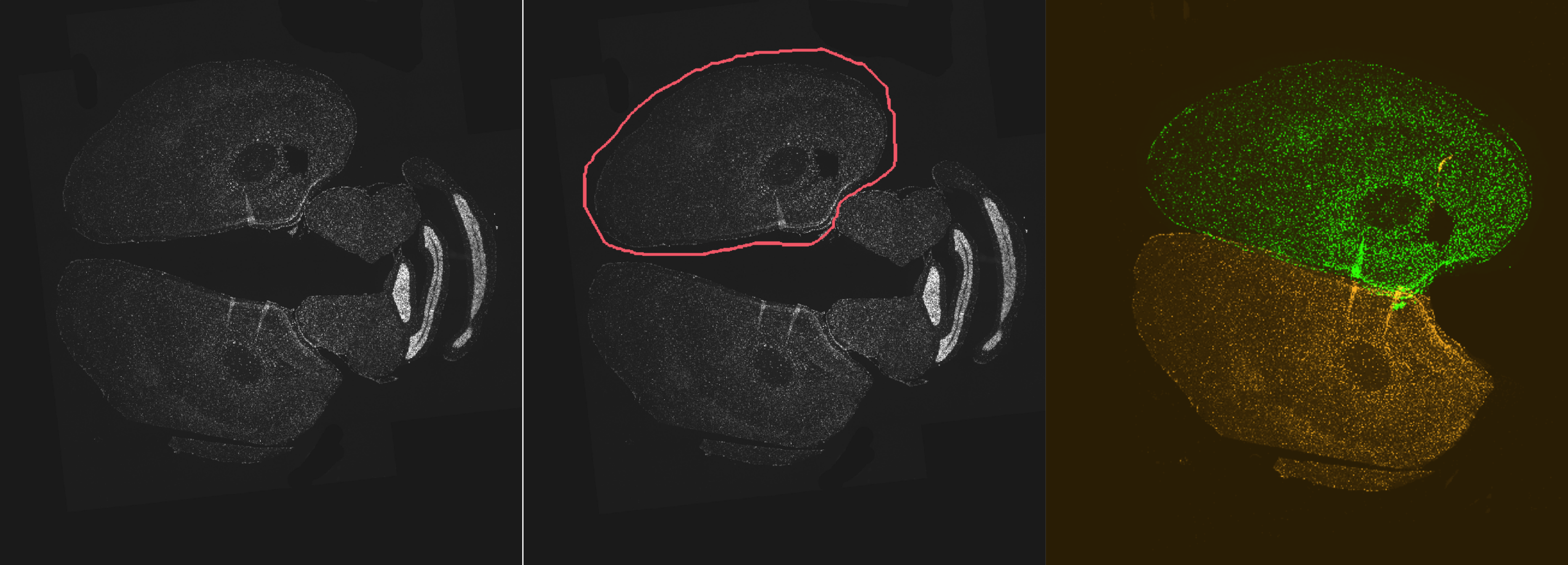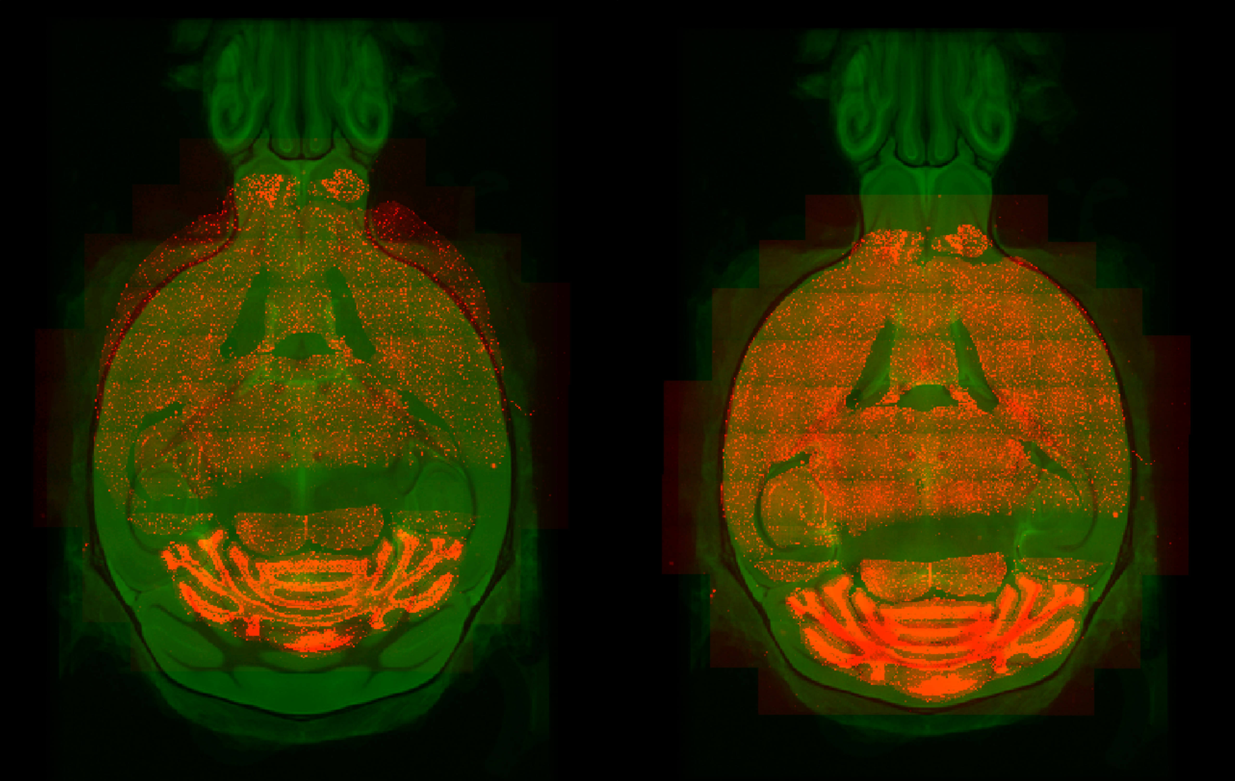 DAPI staining (red) before (left) and after (right) manual registration on an MRI image (green).