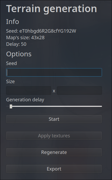 - 'Regenerate' button for regenerating a random map or a map with the entered seed and size