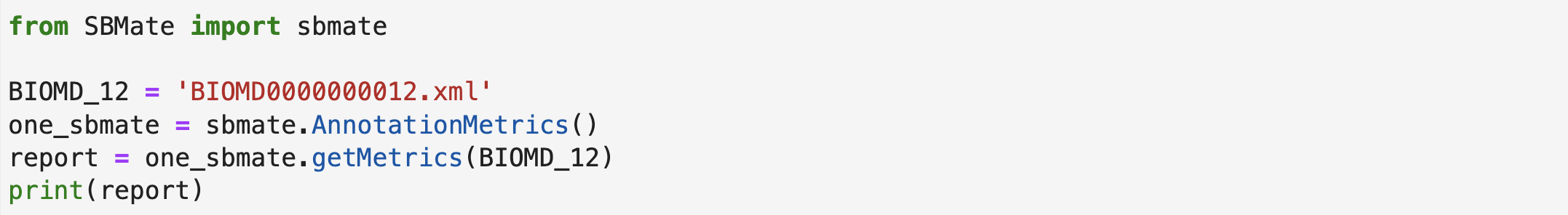 It is quite easy to use SBMate as there is just one main method, sbmate.AnnotationMetrics.getMetrics.