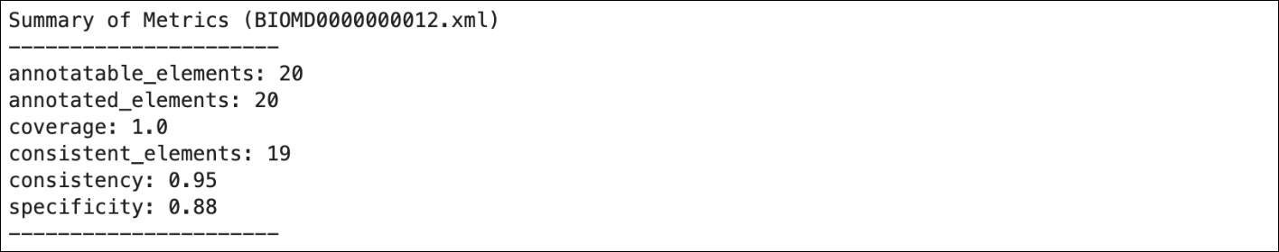 - Coverage checks how many model elements of the above four types (model, reaction, species, and compartment) are actually annotated.