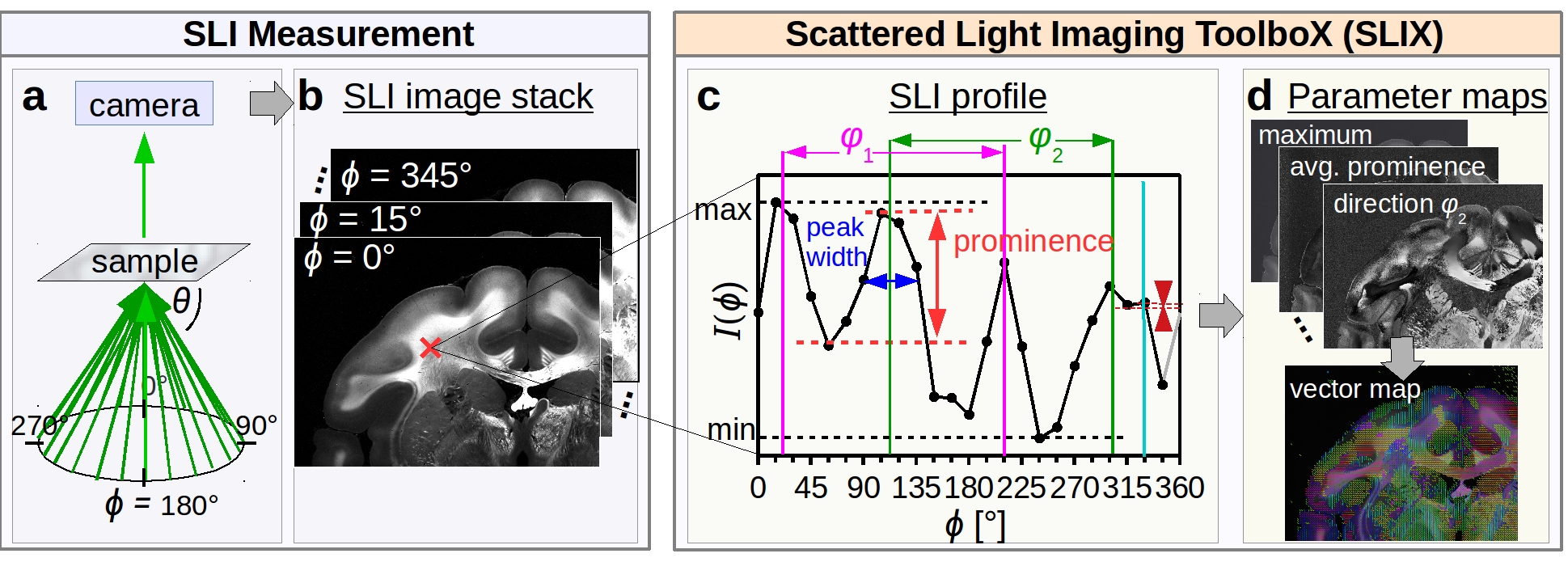 This repository contains the Scattered Light Imaging ToolboX (SLIX) – an open-source Python package that allows a fully automated evaluation of SLI measurements and the generation of different parameter maps. The purpose of SLIX is twofold: First, it allows to transform the raw data of SLI measurements (SLI image stack) to human-readable parameter maps that can be used for further analysis and interpreted by researchers. To this end, SLIX also contains functions to visualize the resulting parameter maps, e.g. as colored vector maps. Second, the results of SLIX can be processed further for use in tractography algorithms. For example, the resulting fiber direction maps can be stored as angles or as unit vectors, which can be used as input for streamline tractography algorithms (Nolden et al. (2019)).