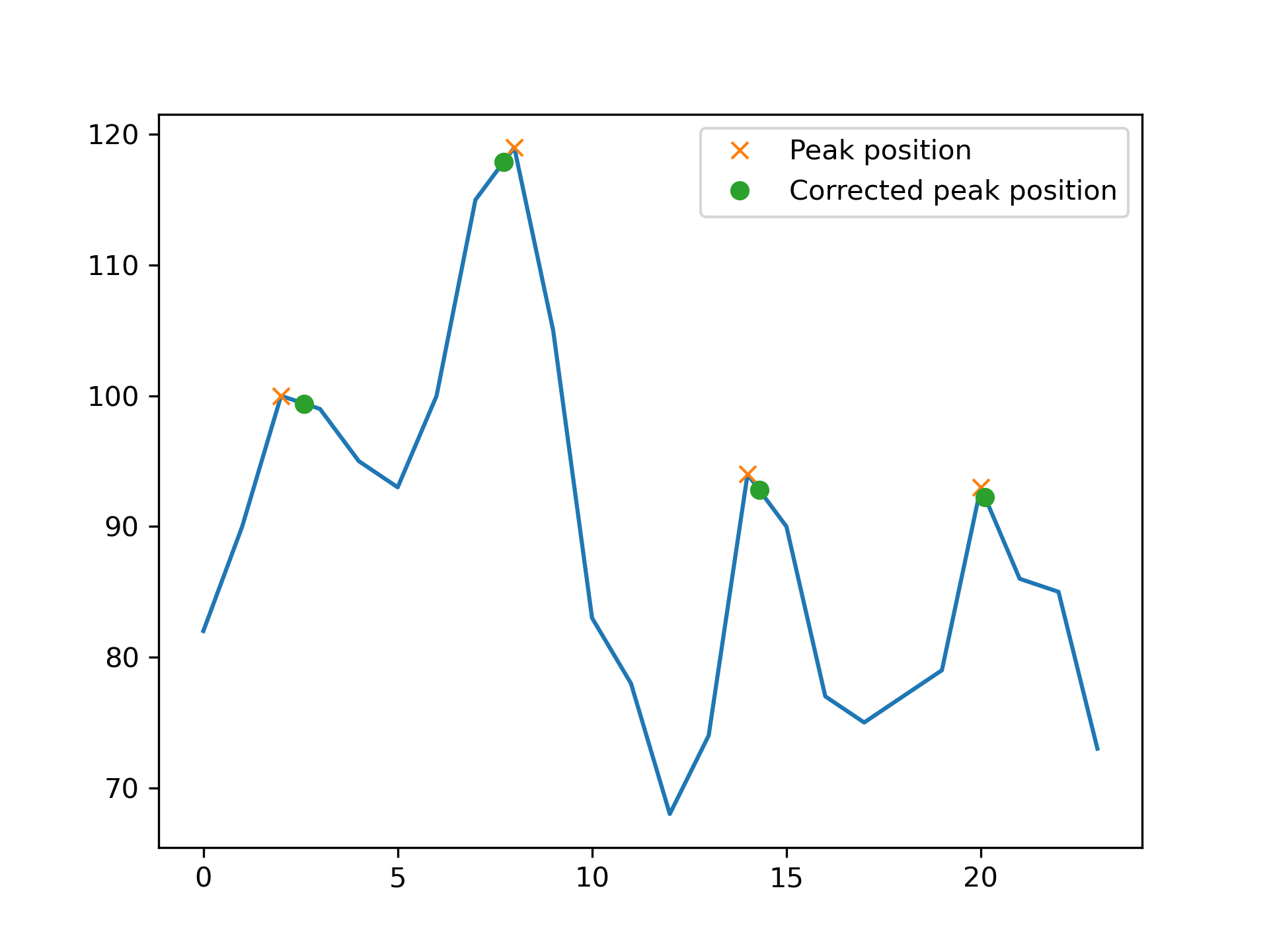 The plot shows the SLI profile derived from a stack of 24 images. The x-axis displays the number of images, the y-axis the measured light intensity [a.u.]. To detect peaks at the outer boundaries, SLIX uses a derived version of SciPys peak finding algorithm which is extended to respect boundary regions; The dots are the original peak positions. The crosses indicate the corrected peak positions, taking the discretization of the profile into account.
