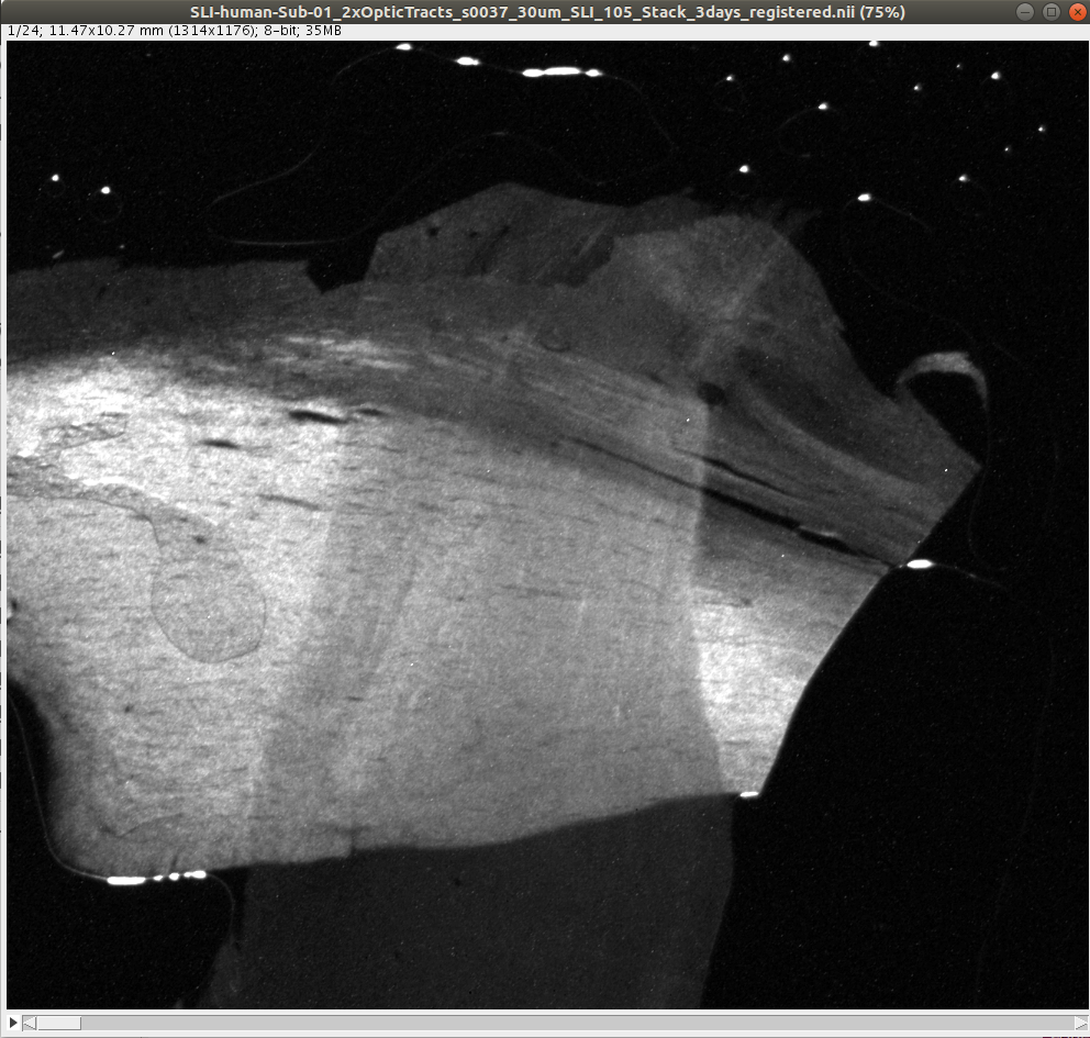 The SLI image stack is used as input for SLIX (.nii or .tiff are accepted). The software assumes that the measurement has been performed with equidistant angles over a full range of 360°. The number of images defines the illumination angles (e.g. when using 24 images as input, the software assumes that the images were recorded with = 0°,15°,...,345°).