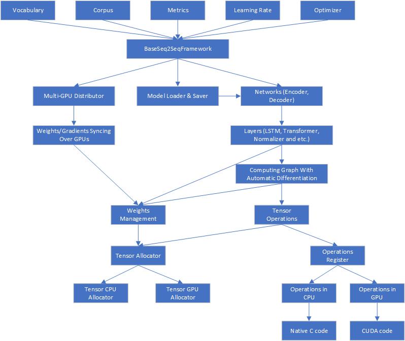 - Implement forward part only for your network and the BaseSeq2SeqFramework will handle all other things, such as backward propagation, parameters updates, memory management, computing graph managment, corpus shuffle & batching, saving/loading for model, logging & monitoring, checkpoints and so on. Here is an example in AttentionSeq2Seq.cs as well.