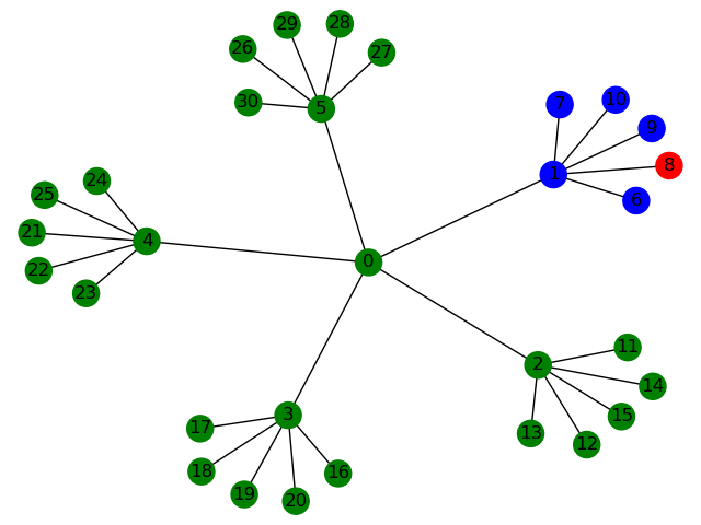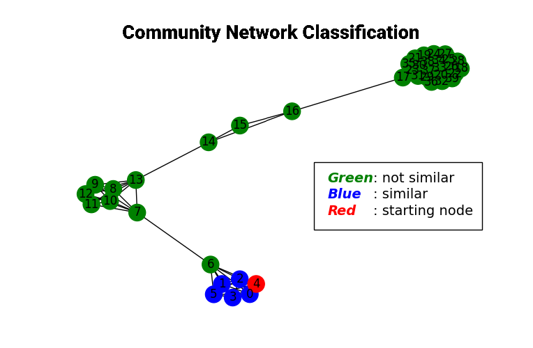 draw_community(): Draws a networkx plot highlighting some specific nodes in that network. The last node is higlighted in red, the remaining nodes in "nodes_result" are in blue, while the rest of the network is green.
