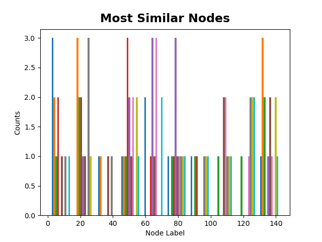 nodes, similarity = xn2v.similar_nodes(G, dim=128, walk_length=20, context=5, picked=10, p=0.1, q=0.9, workers=4)
