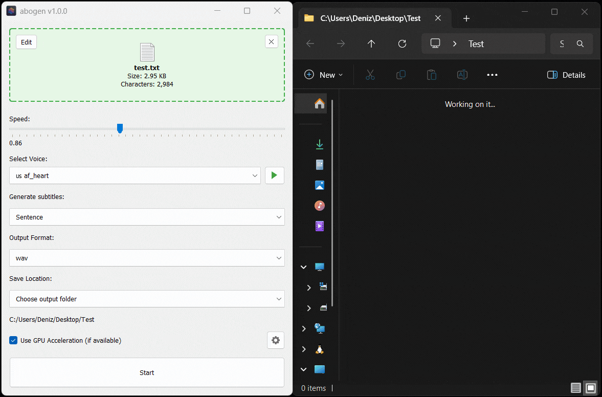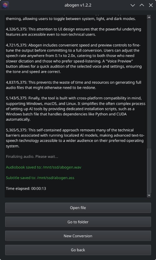 Here’s Abogen in action: in this demo, it processes ∼3,000 characters of text in just 11 seconds and turns it into 3 minutes and 28 seconds of audio, and I have a low-end RTX 2060 Mobile laptop GPU. Your results may vary depending on your hardware.