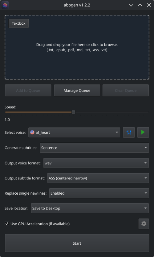 Abogen is a powerful text-to-speech conversion tool that makes it easy to turn ePub, PDF, text, markdown, or subtitle files into high-quality audio with matching subtitles in seconds. Use it for audiobooks, voiceovers for Instagram, YouTube, TikTok, or any project that needs natural-sounding text-to-speech, using Kokoro-82M.