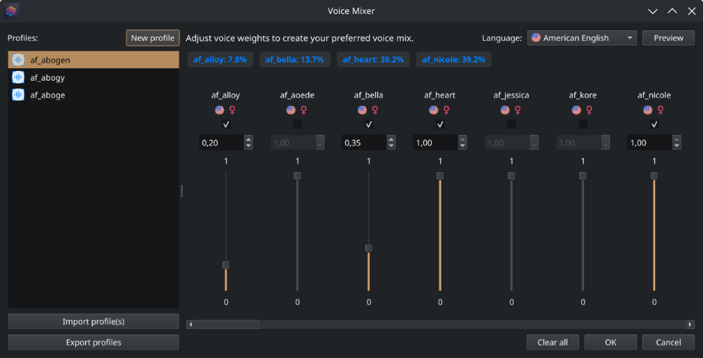 | Voice mixer | Create custom voices by mixing different voice models with a profile system. See Voice Mixer for more details. |