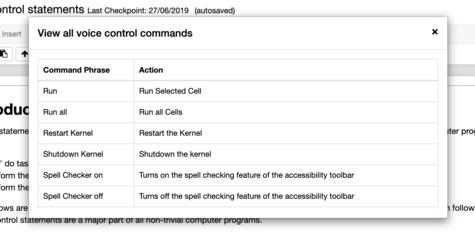 - The aim of this extension is to provide voice control support for some of the common actions on a Jupyter notebook.