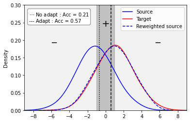 | Quick-Start Plotting Results. The dotted and dashed lines are respectively the class separation of the "source only" and KMM models. Note that the predicted positive class is on the right of the dotted line for the "source only" model but on the left of the dashed line for KMM. (The code for plotting the Figure is available here) |
