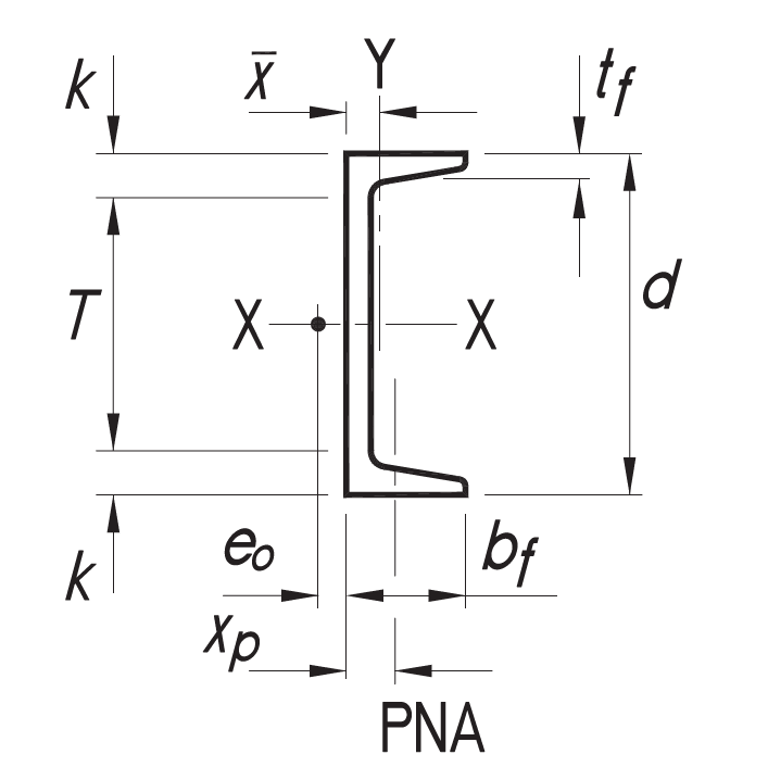 x(bar) = Distance from outside face of web of channel shape or outside face of angle leg to Y-axis (in.)