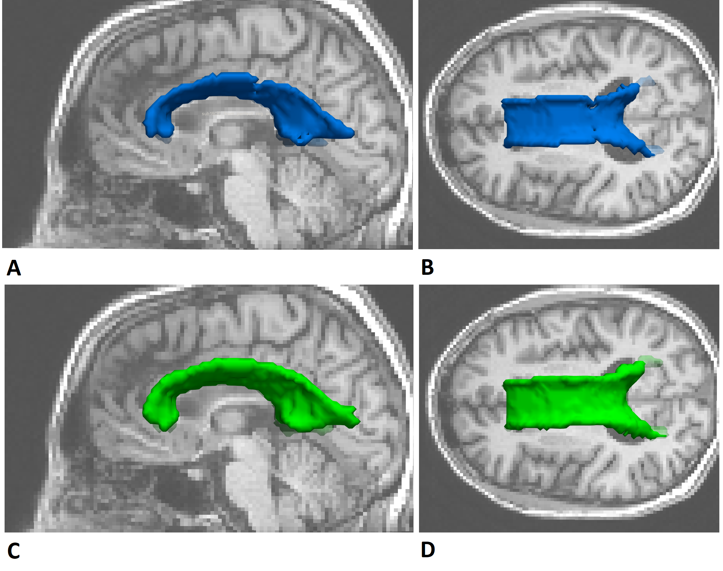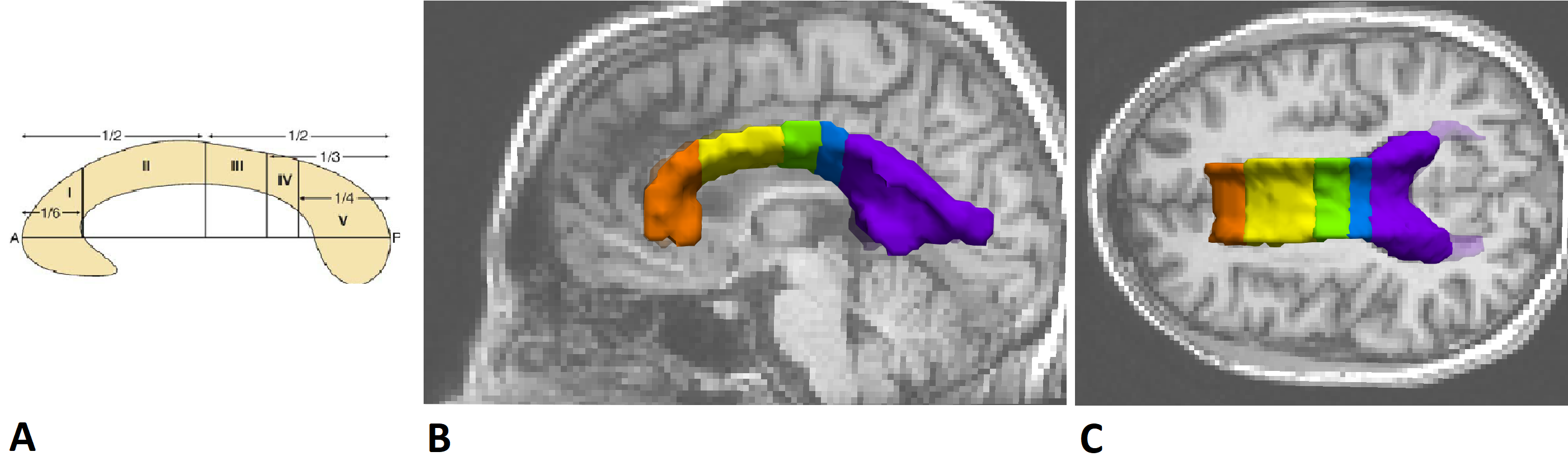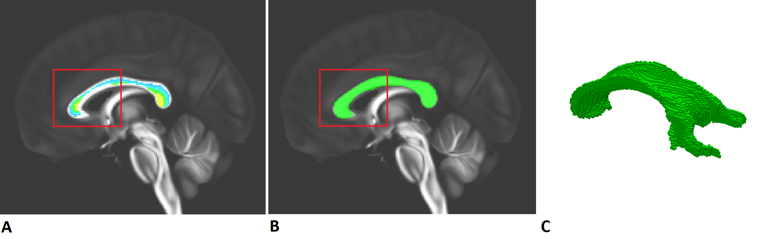 Corpus_callosum_reg.py: This is the code corresponding to the creation of our CC. As we can see on the following image, the downloaded Corpus Callosum was not of good quality (Fig A.) so we drew it ourselves (thanks to MRIcron) as depicted in Fig B. and its 3D representation (Fig C.). However, you don't need the registration_CC_on_perfect function and the last part of this file (MASK FA). You will only need to resubmit the reg_CC_on_sub if you have new patients.