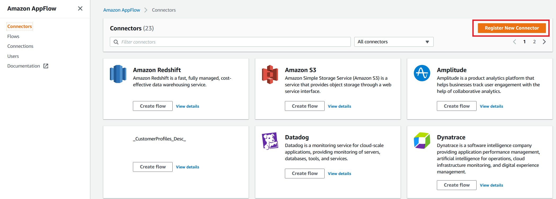i) Go to the Amazon AppFlow console and select “Connectors” on the left-side menu.