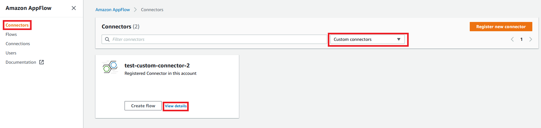 Go the Amazon AppFlow console and click on “Connectors” on the left menu. Select “Custom connectors” in the drop down list.