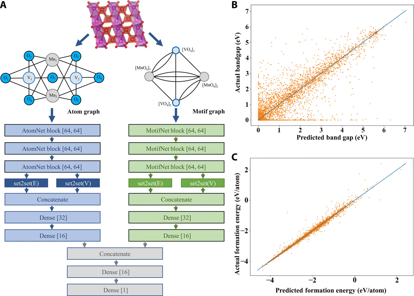 AMDNet architecture and materials property predictions. (A) Demonstration of the learning architecture of the proposed atom-motif dual graph network (AMDNet) for the effective learning of electronic structures and other material properties of inorganic crystalline materials. (B) Comparison of predicted and actual bandgaps [from density functional theory (DFT) calculations] and (C) comparison of predicted and actual formation energies (from DFT calculations) in the test dataset with 4515 compounds.