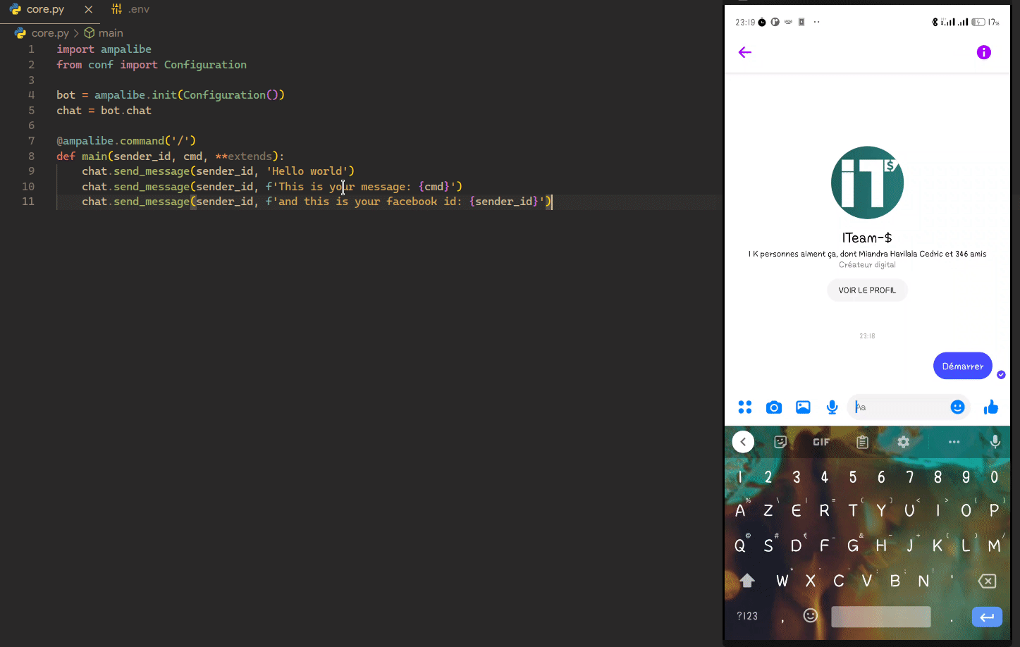 Ampalibe is a light Python framework for quickly creating Facebook Messenger bots. It provides a new concept, it manages webhooks, processes data sent by Facebook and provides API Messenger with advanced functions such as payload management, item length, and more.