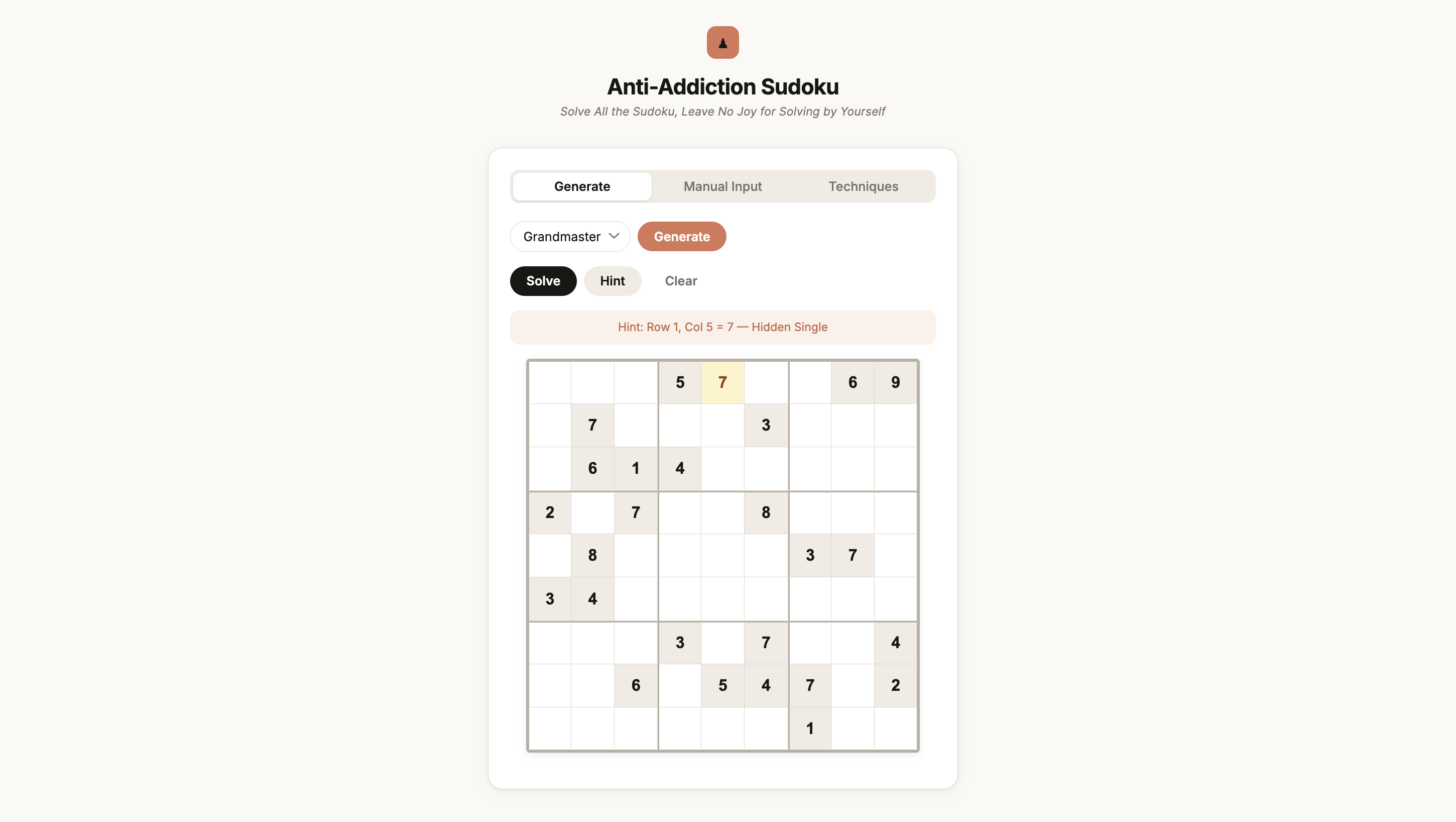 The web UI lets you generate puzzles or type one in manually, then solve it — or get step-by-step hints.