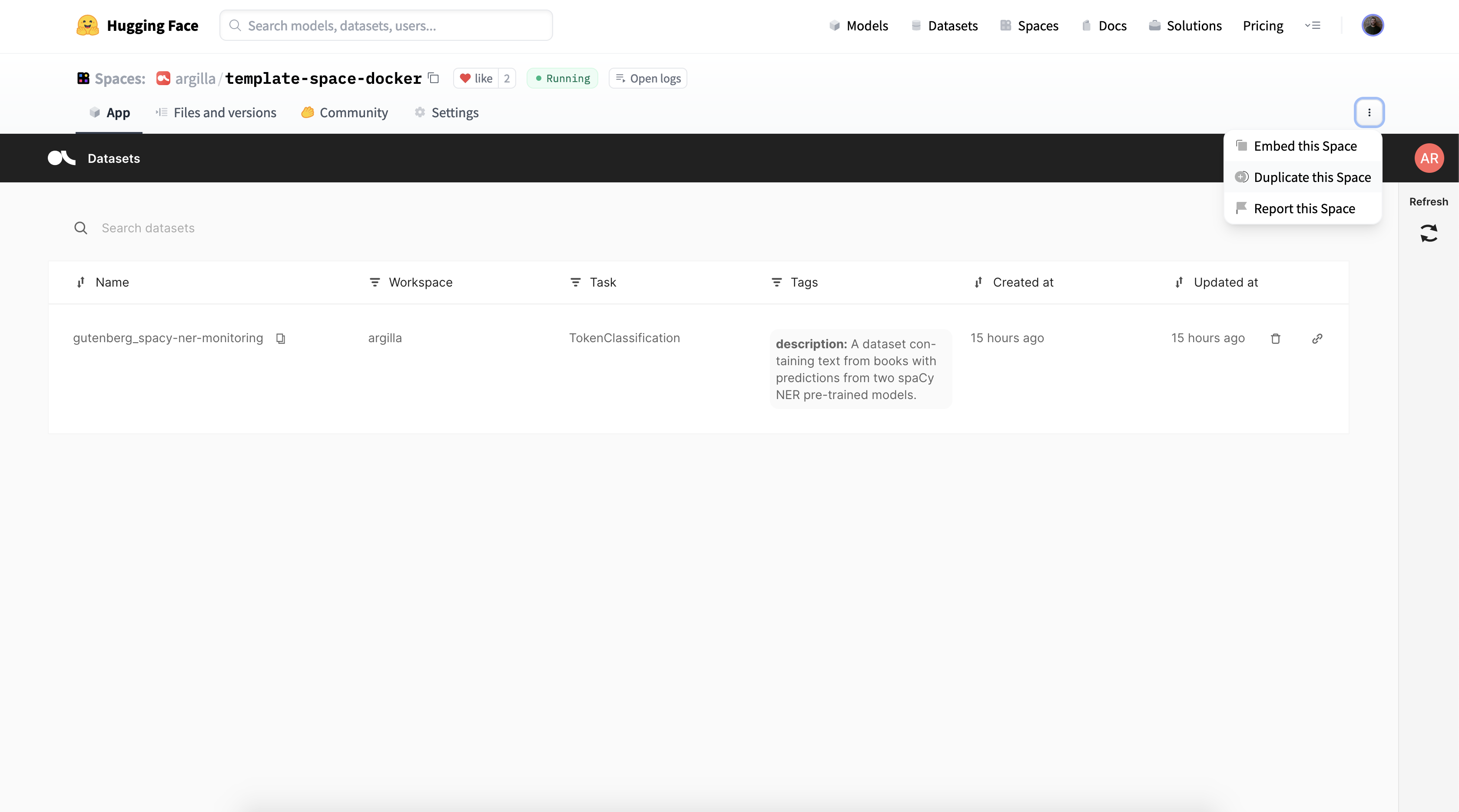 HuggingFace Spaces now have persistent storage and this is supported from Argilla 1.11.0 onwards, but you will need to manually activate it via the HuggingFace Spaces settings. Otherwise, unless you're on a paid space upgrade, after 48 hours of inactivity the space will be shut off and you will lose all the data. To avoid losing data, we highly recommend using the persistent storage layer offered by HuggingFace.LLM support