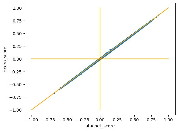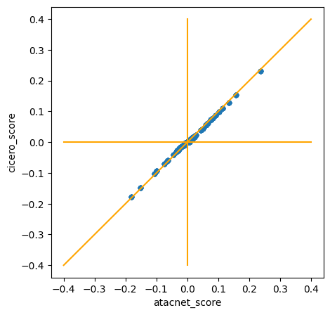 Currently, scores are very close when applied to the same metacells, computed from Cicero's methodology. (cf comparison plots below). It should run significantly faster than Cicero (e.g.: running time of 5 sec instead of 17 min for the dataset 2).