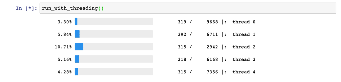 In the snapshot of the progress bars above, the outer loop is in its 3rd iteration. The inner loop has completed twice and is running the third. The progress bars for the completed tasks move up. The progress bars for the active tasks are growing at the bottom.