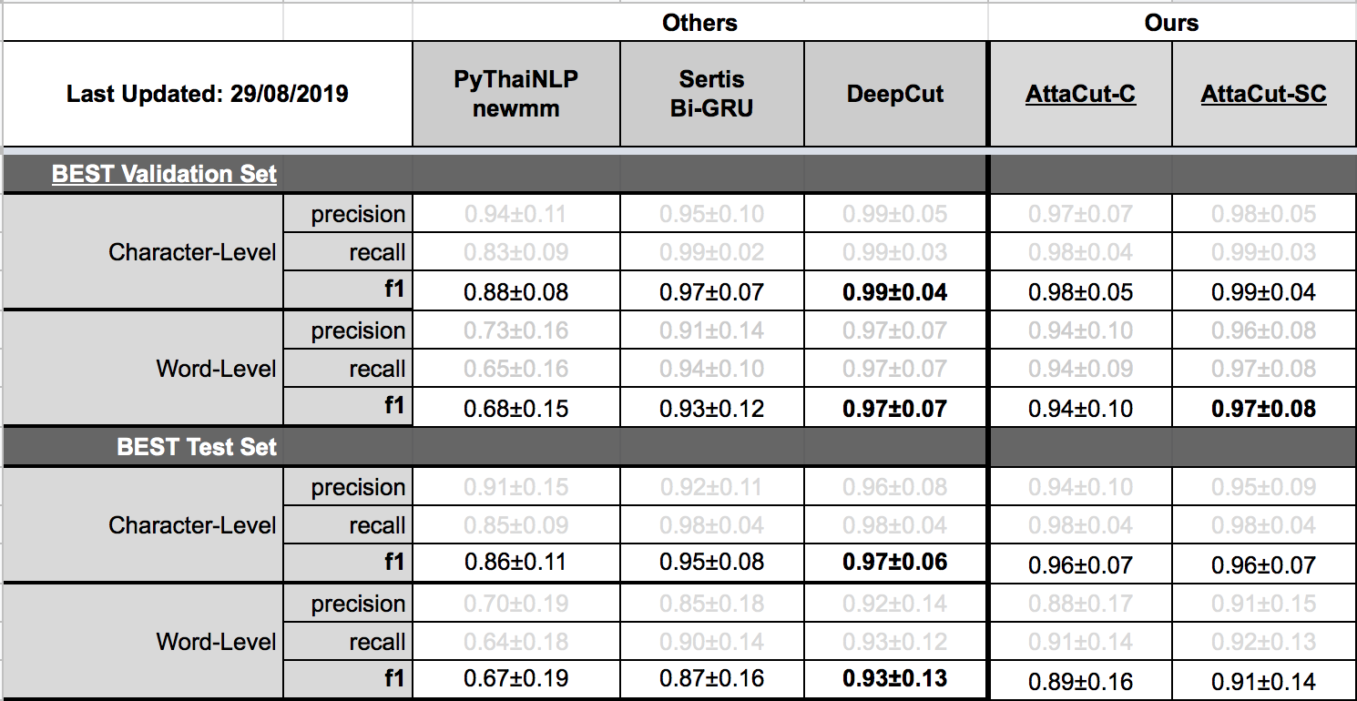 TL;DR: 3-Layer Dilated CNN on syllable and character features. It’s 6x faster than DeepCut (SOTA) while its WL-f1 on BEST is 91%, only 2% lower.