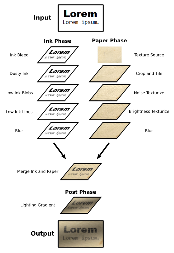 After both the ink and paper phases are completed, processing continues by applying the ink, with its desired effects, to the paper. This merged document image is then augmented further with distortions such as adding folds or other physical deformations or distortions that rely on simultaneous interactions of paper and ink layers.