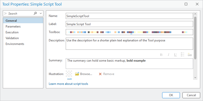 Documentation can be added to a Toolbox, ScriptTool, or Parameter. On a Toolbox:
