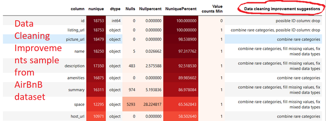 As of version 0.1.50, if you set verbose=1 AutoViz now automatically analyzes your dataset and provides suggestions for how to clean your variables in your data set. It detects missing values, rare categories, infinite values, mixed data types, and so much more. This will help you speed up your data cleansing activities. If you have suggestions to add more data cleaning activities please add an Issue in our GitHub and we will gladly consider it. Here is an example of how it looks: