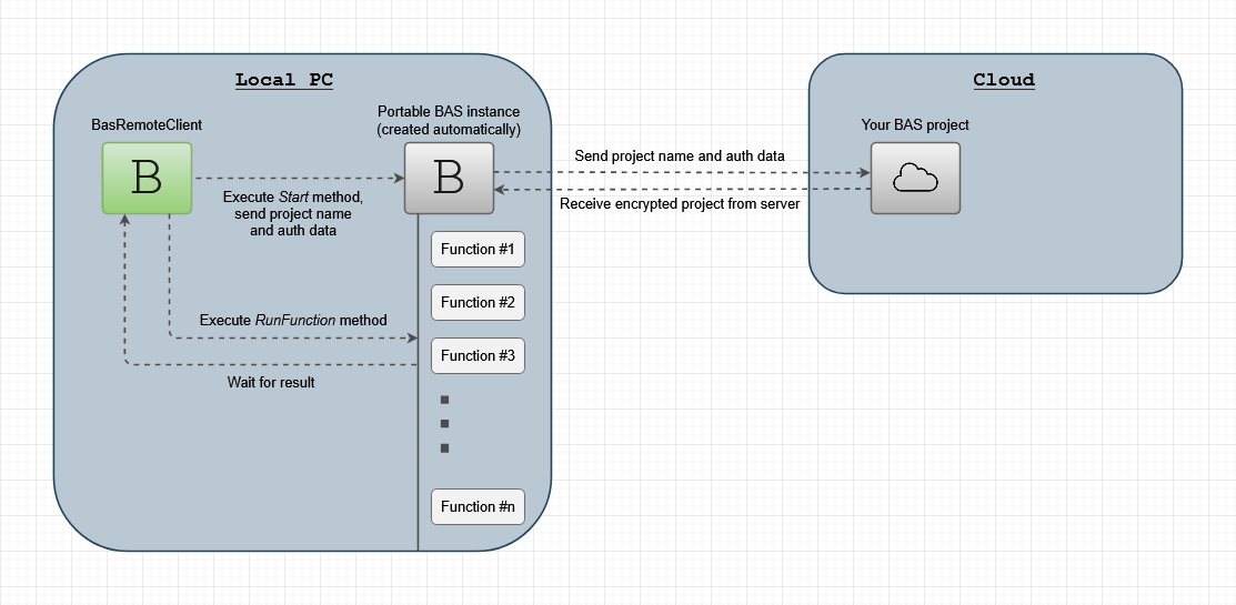 Running custom code section explains how to prepare your project and upload it into the cloud. Portable BAS instance is downloaded and started automatically, it is also closed automatically when BasRemoteClient gets closed. Folder, where portable BAS instance is located by default is data folder relative to executable. It can be customized by using options.working_dir setting.