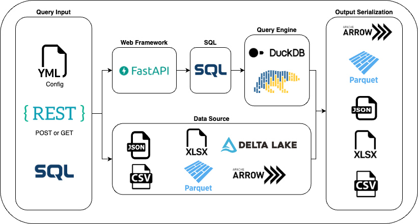 DuckDB is the default query engine. Polars is also supported, but lack some features. The query engine can be specified at the route level and at the query level with the hidden parameter $engine="duckdb|polars". If you want polars, add the required extra.