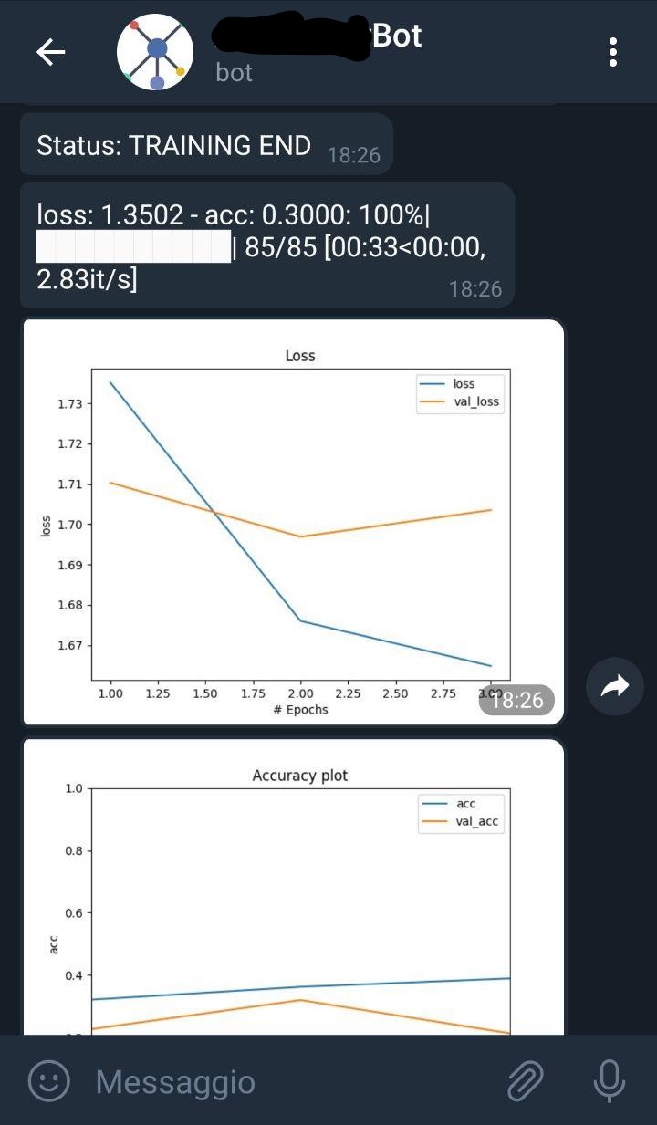 Bob Telegram Tools is a python library which allows you to monitor your machine learning methods just by using Telegram without any additional application.