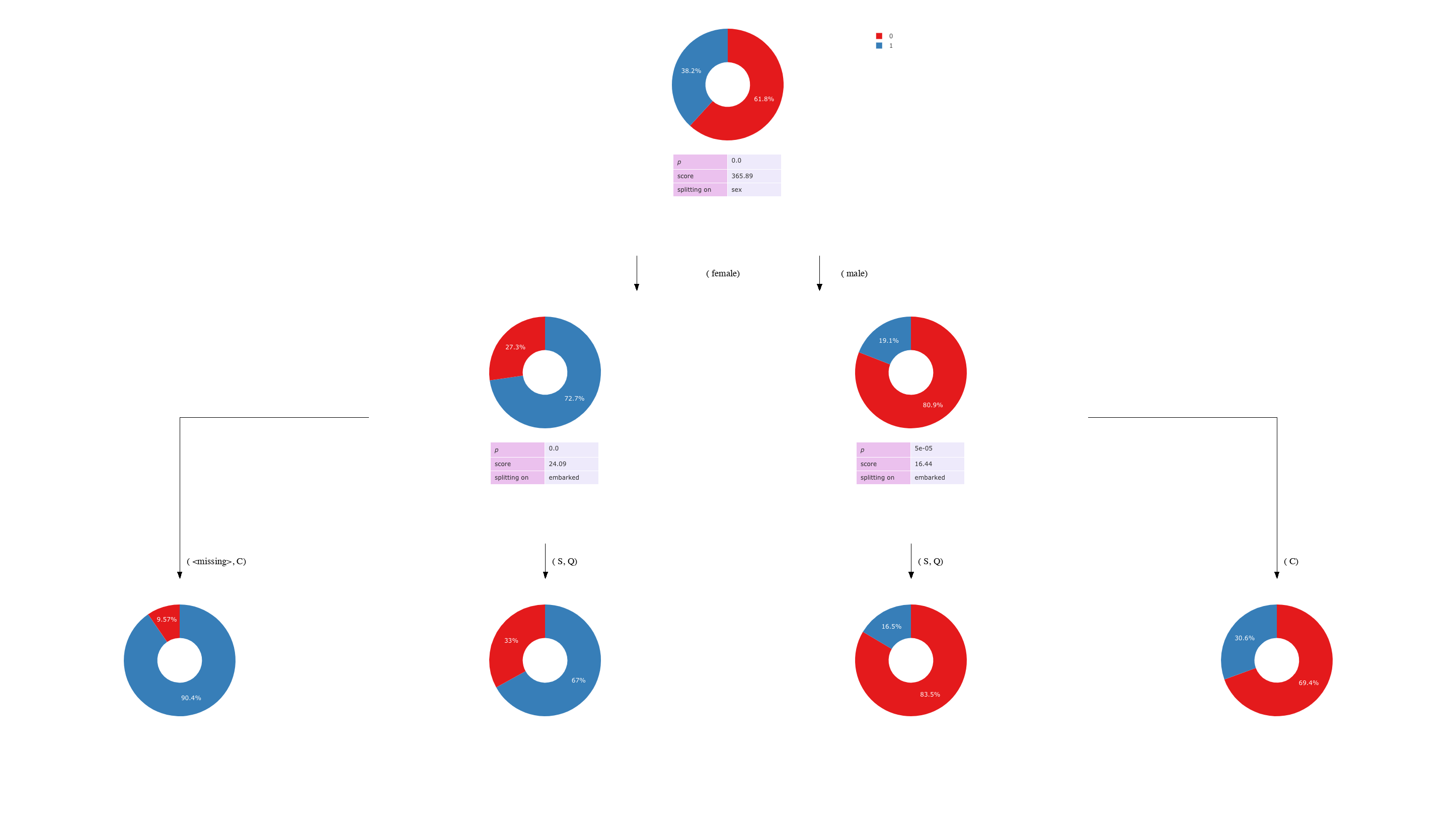└── (['male'], {0: 682, 1: 161}, (embarked, p=5.017855245e-05, score=16.4413525404, groups=[['C'], ['Q', 'S']]), dof=1))